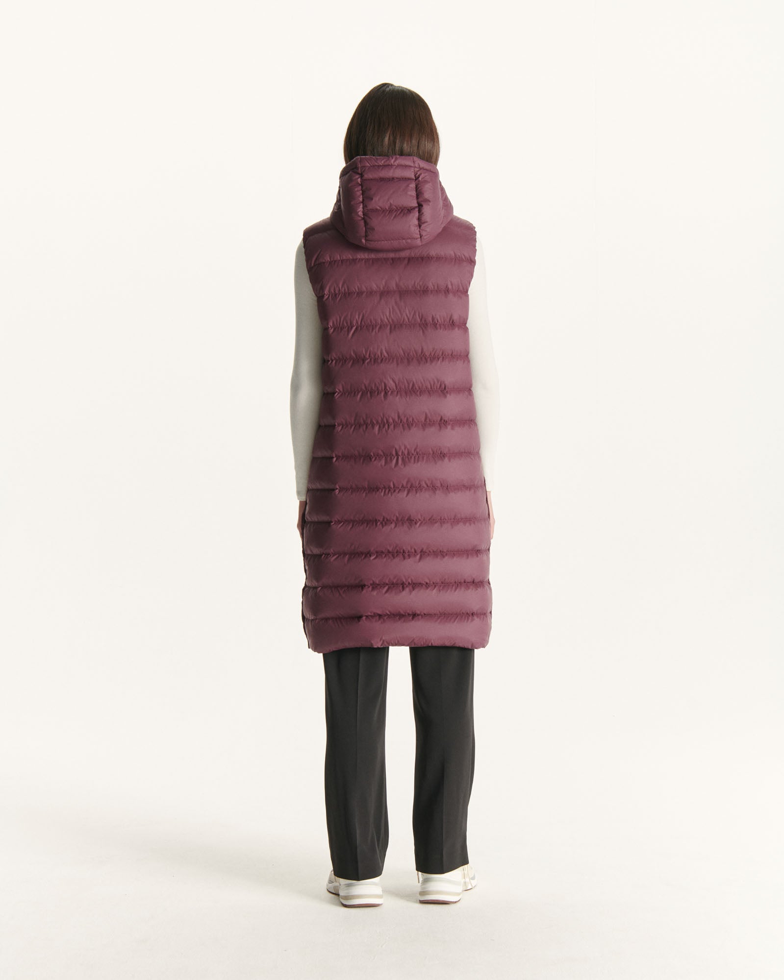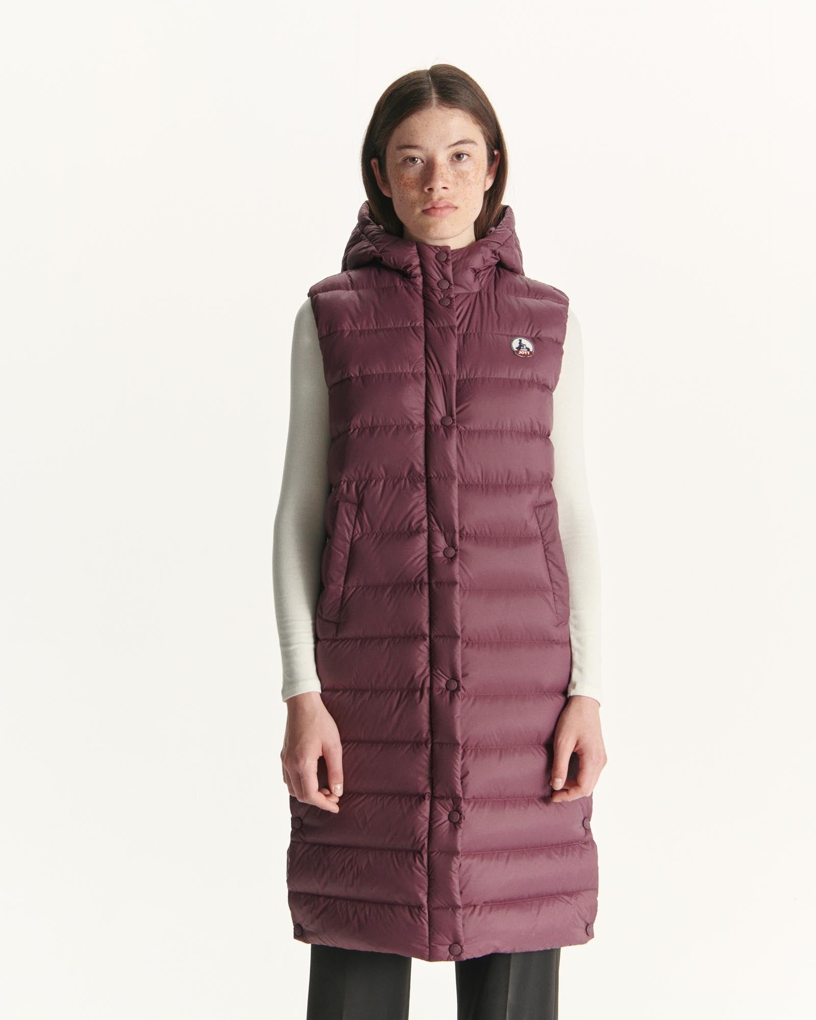 LOLA de JOTT, un ovni dans l’univers des doudounes ! Très longue, elle propose, selon l’envie, un porter sage ou plus libre grâce aux fentes en bas du vêtement à ouvrir ou fermer (pressions). Sans manches, on la porte aussi bien sur de la maille à la mi-saison que superposée à une doudoune légère en hiver. Son col assez haut et sa capuche vous protègent parfaitement. LOLA est coupée dans une matière en fibres recyclées légèrement mat et réalisée dans un matelassage aux piqures larges et contemporaines. Un vêtement unique.